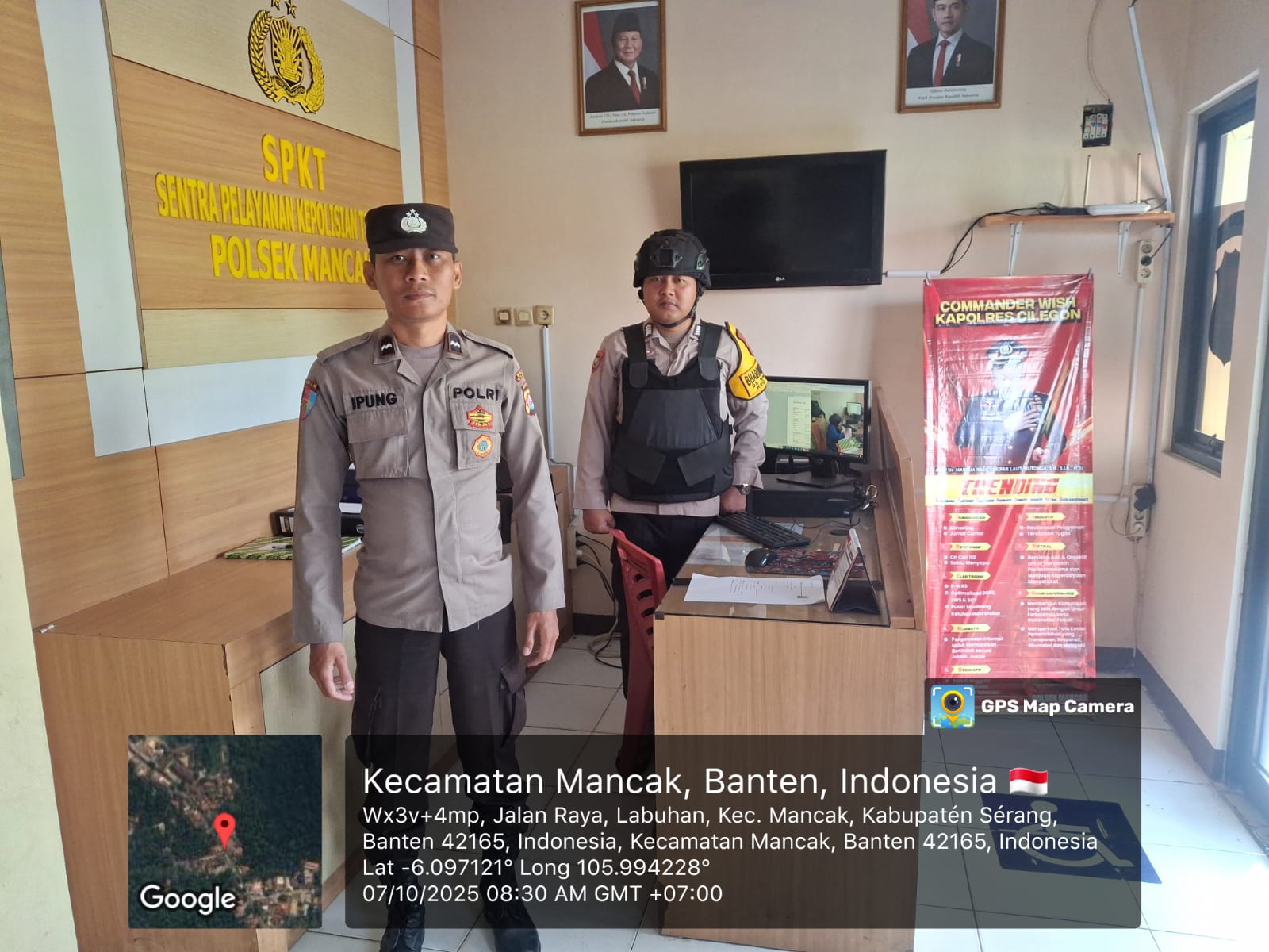 “Anggota piket jaga Polsek Mancak AIPDA IPUNG H, BRIPKA JUHARDI Melaksanakan Sispam Mako dilengkapi dengan bodyvest, helm kevlar, dan senjata api salah satu upaya peningkatan kemanan mako guna mencegah hal-hal yang tidak dapat di duga selama pelayan berlangsung.”