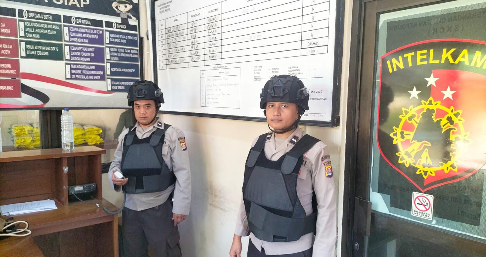 “Anggota piket jaga Polsek Mancak AIPDA HERMAN, AIPDA PESTA PANGITUHAN. Melaksanakan Sispam Mako dilengkapi dengan bodyvest, helm kevlar, dan senjata api salah satu upaya peningkatan kemanan mako guna mencegah hal-hal yang tidak dapat di duga selama pelayan berlangsung.”