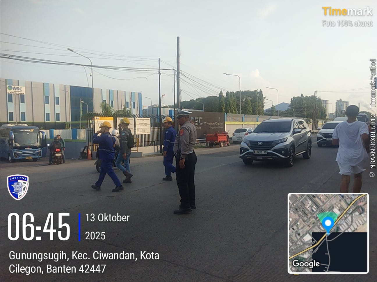 Cilegon - Personil  Polsek Ciwandan Polres Cilegon Polda Banten melaksanakan giat Strong Poin Pengaturan Lalu Lintas Disimpang Brown Kelurahan Gunung Sugih guna menciptakan ketertiban, keamanan dan Kelancaran Lalu-lintas bagi masyarakat, Senin (13/10/2025).