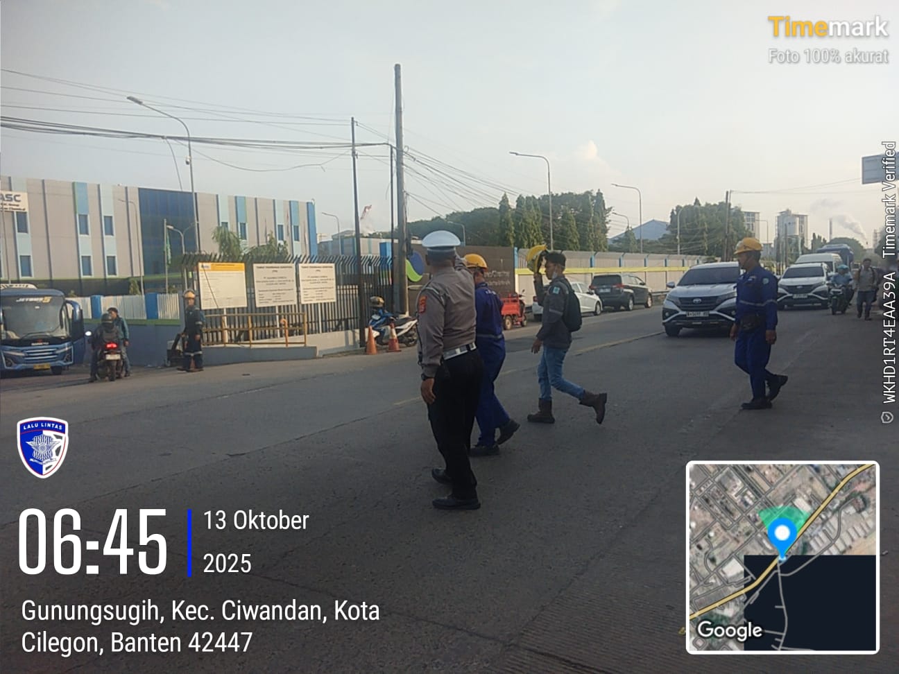 Cilegon - Personil Polsek Ciwandan Polres Cilegon Polda Banten melaksanakan giat Strong Poin Pengaturan Lalu Lintas Disimpang Brown Kelurahan Gunung Sugih guna menciptakan ketertiban, keamanan dan Kelancaran Lalu-lintas bagi masyarakat, Senin (13/10/2025).