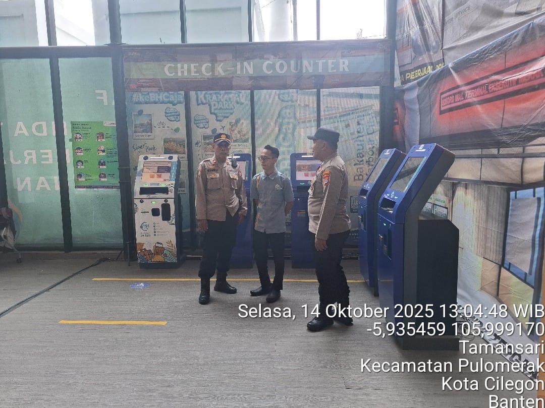 Cilegon - Personel Polsek Kskp Merak Polres Cilegon Polda Banten melaksanakan sambang dan patroli kawasan pelabuhan merak dalam rangka menjaga Harkamtibmas di Kawasan Pelabuhan Merak, Selasa (14/10/2025).