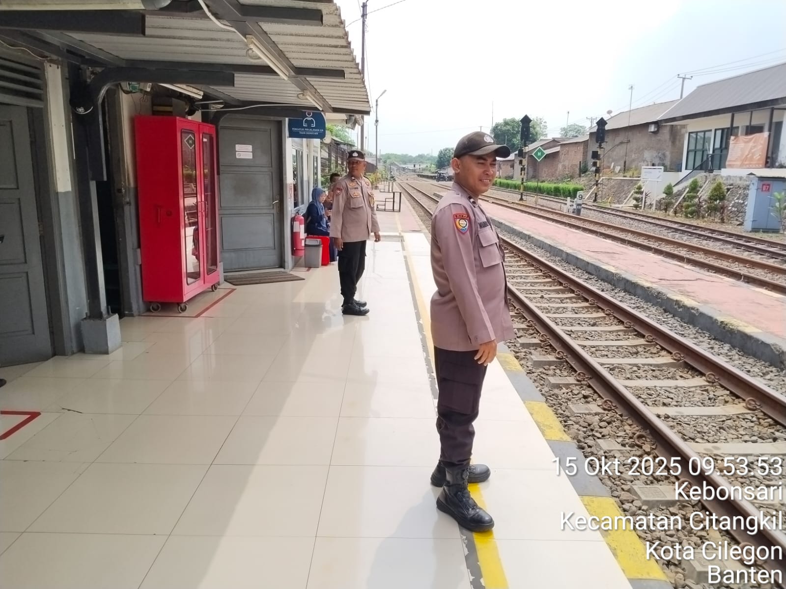 Cilegon - Personil Polsek Ciwandan Polres Cilegon Polda Banten melaksanakan giat patroli Dan dengan sambangi Petugas Stasiun Kereta Api dan penjaga pintu perlintasan kereta api,Rabu (15/10/2025).