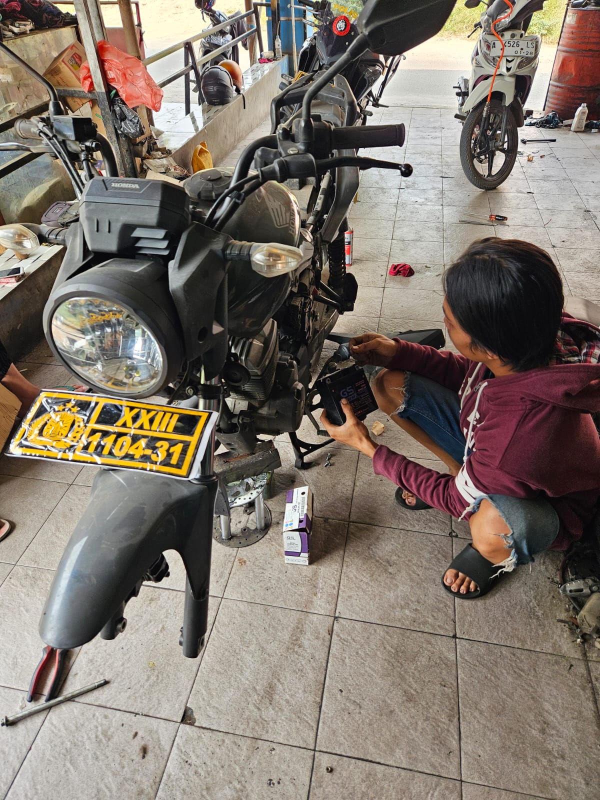 Cilegon Polres cilegon Polda Banten Staf Logistik melakukan pengecekan perawatan kendaraan dinas roda 2 yang sedang di lakukan perawatan.