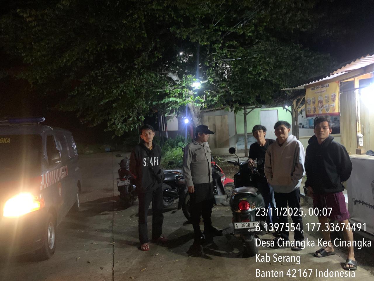 *Polres Cilegon* – Dalam Rangka Pencegahan Kejahatan Jalanan dan Memelihara situasi keamanan dan menjaga serta memberikan rasa aman dan nyaman di masyarakat,Salah satu upaya untuk mewujudkan hal tersebut sebagaimana yang dilakukan oleh Personil Polsek Cinangka Polres Cilegon Polda Banten melaksanakan giat patroli blue light malam hari hingga menjelang pagi, Minggu (23/11/2025).