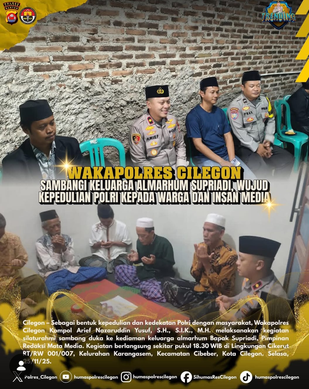 Wakapolres Cilegon,menyambangi rumah duka Bapak Supriadi, pimpinan Mata Media, yang terletak di Cilegon, pada hari ini. Kunjungan ini merupakan bentuk kepedulian dan empati Polres Cilegon kepada masyarakat, khususnya kepada keluarga yang ditinggalkan.
