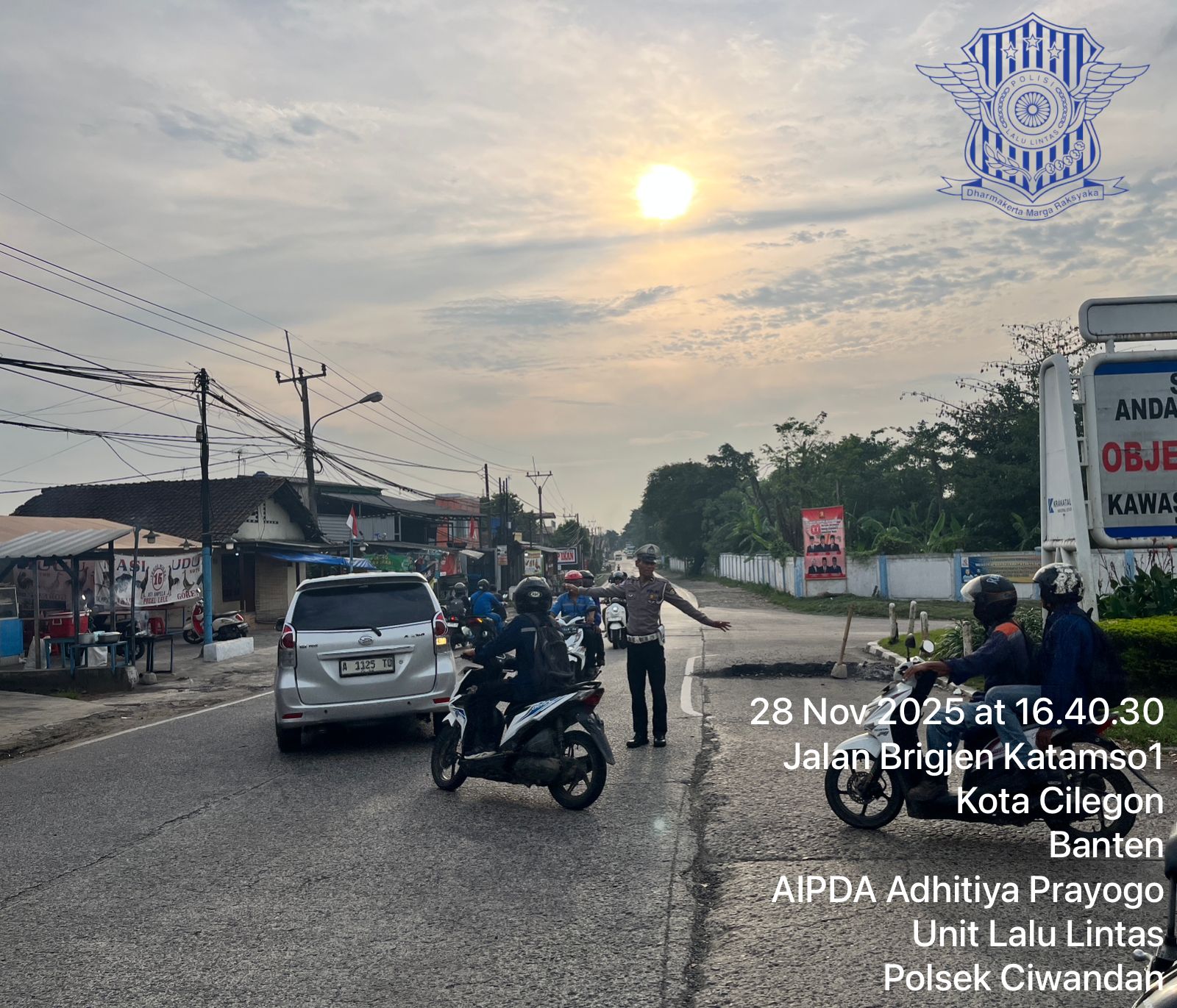 Cilegon - Guna Kelancaran Lalu-lintas Personil Unit Lantas Polsek Ciwandan Polres Cilegon Polda Banten melaksanakan pengaturan lalu-lintas di Simpang Beringin Ciwandan Pertigaan Kawasan Industri KSP/ KIEC I  kelurahan Warnasari Kecamatan Citangkil Kota Cilegon, Minggu (30/11/2025).