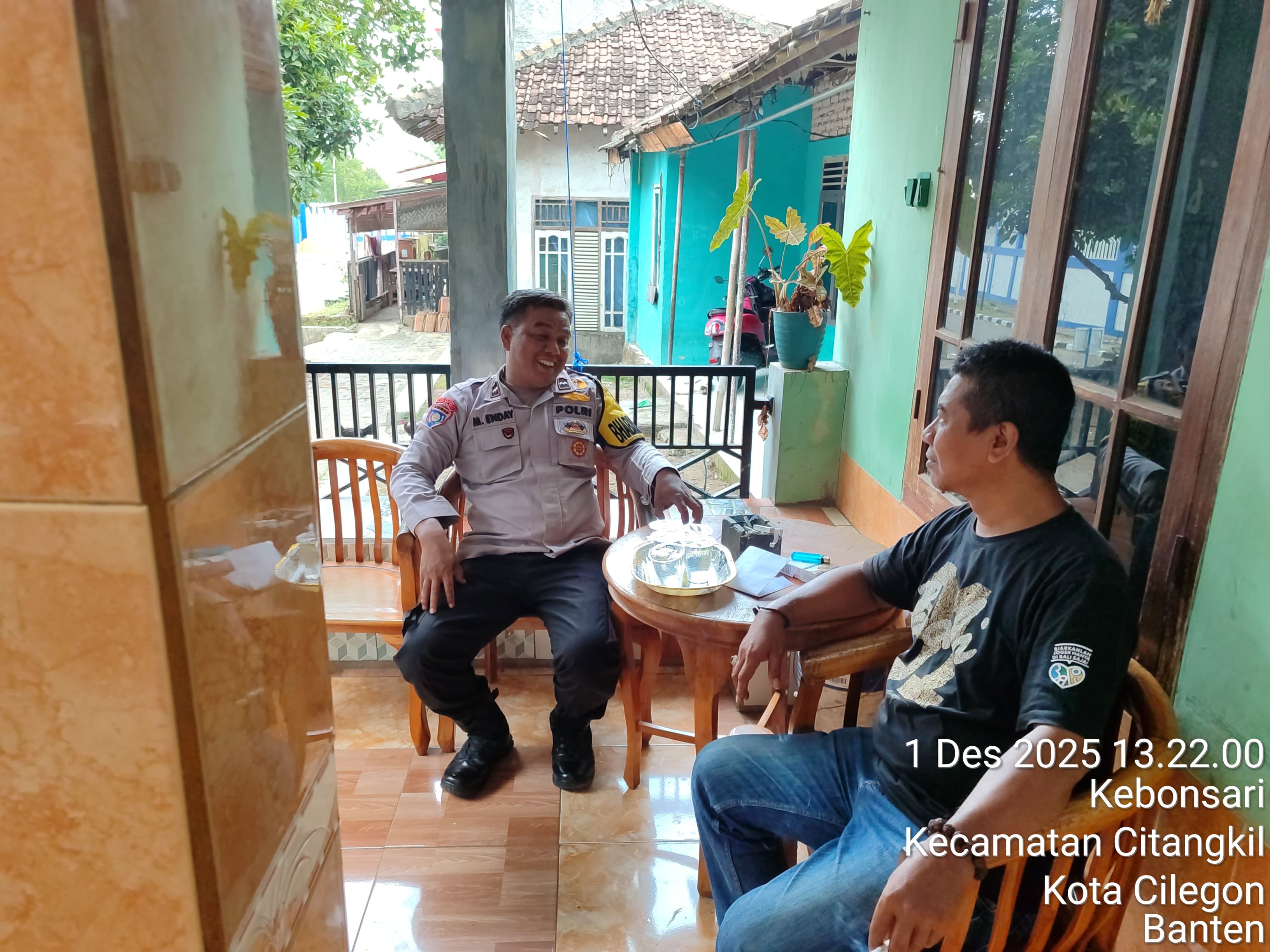Cilegon -  Bhabinkamtibmas Polsek Ciwandan Polres Cilegon Polda Banten Menyapa warga serta Ajak warga Binaannya untuk berperan aktif jaga keamanan lingkungan serta jalin komunikasi agar tercipta situasi aman di daerah hukum Polsek Ciwandan Polres Cilegon Polda Banten,Senin (01/12/2025).