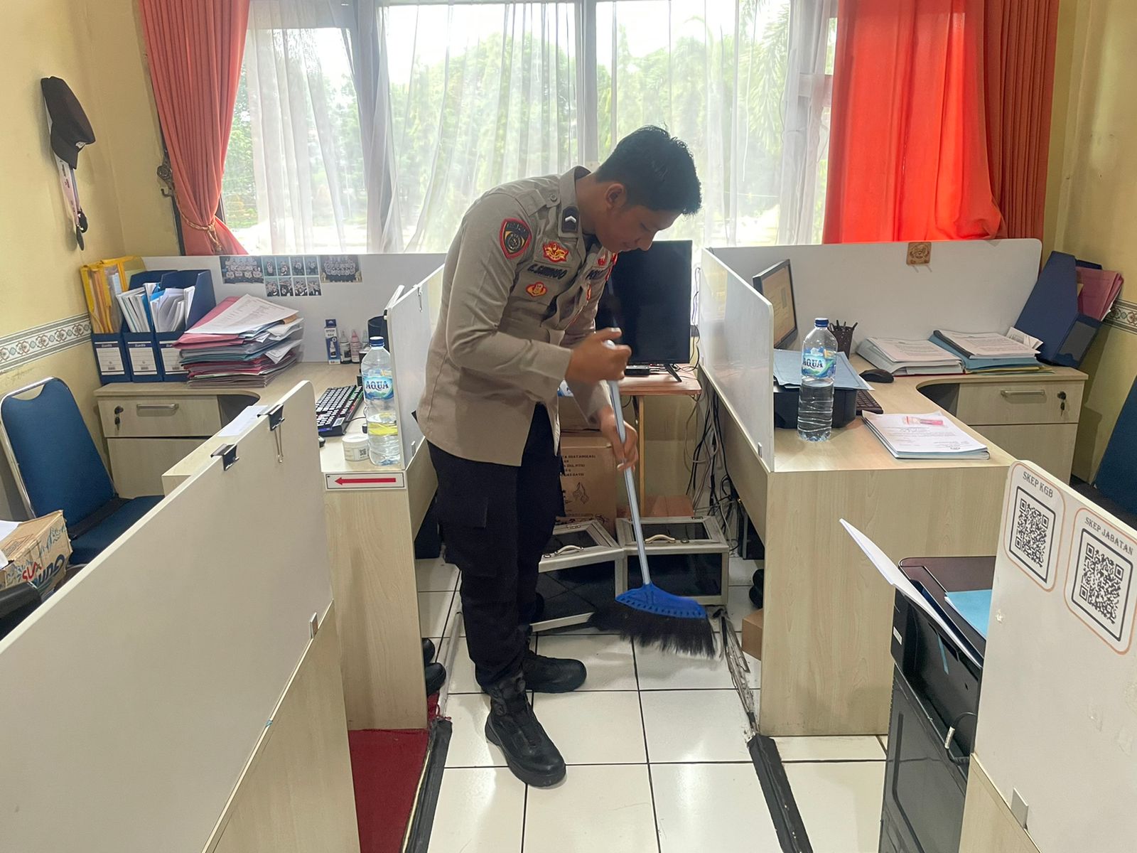 Anggota Bag SDM Polres Cilegon, sselalu melaksanakan aktivias rutin dalam membersihkan ruangan kerja.