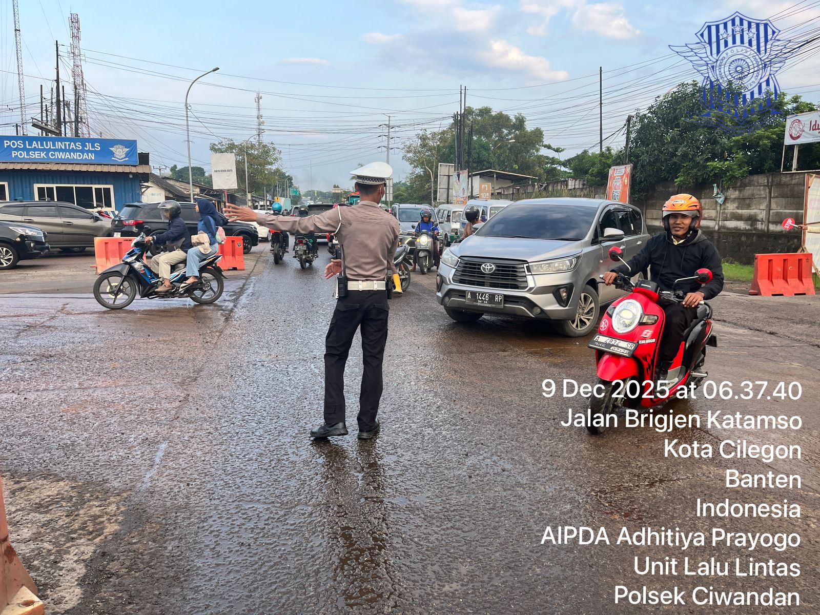 Cilegon - Personil Polsek Ciwandan Polres Cilegon Polda Banten melaksanakan giat Strong Poin Pengaturan Lalu Lintas Disimpang Brown Kelurahan Gunung Sugih guna menciptakan ketertiban, keamanan dan Kelancaran Lalu-lintas bagi masyarakat, Senin (08/12/2025).