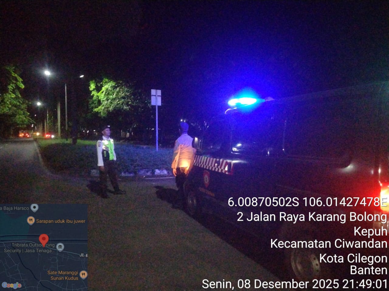 Cilegon - Personil Polsek Ciwandan Polres Cilegon Polda Banten Dalam Pelaksanaan Kegiatan Patroli dengan menyalakan lampu rotator berwarna biru di Daerah Hukum Polsek Ciwandan Polres Cilegon Polda Banten dari malam hingga dini hari, dalam rangka menciptakan situasi aman dan kondusif, Senin (08/12/2025).