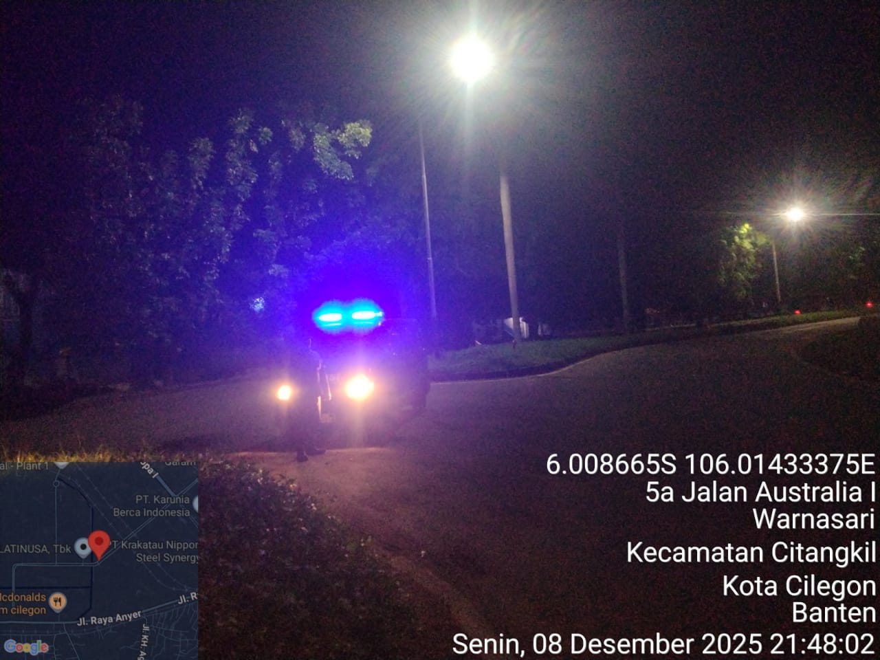 Cilegon - Personil Polsek Ciwandan Polres Cilegon Polda Banten Dalam Pelaksanaan Kegiatan Patroli dengan menyalakan lampu rotator berwarna biru di Daerah Hukum Polsek Ciwandan Polres Cilegon Polda Banten dari malam hingga dini hari, dalam rangka menciptakan situasi aman dan kondusif, Senin (08/12/2025).