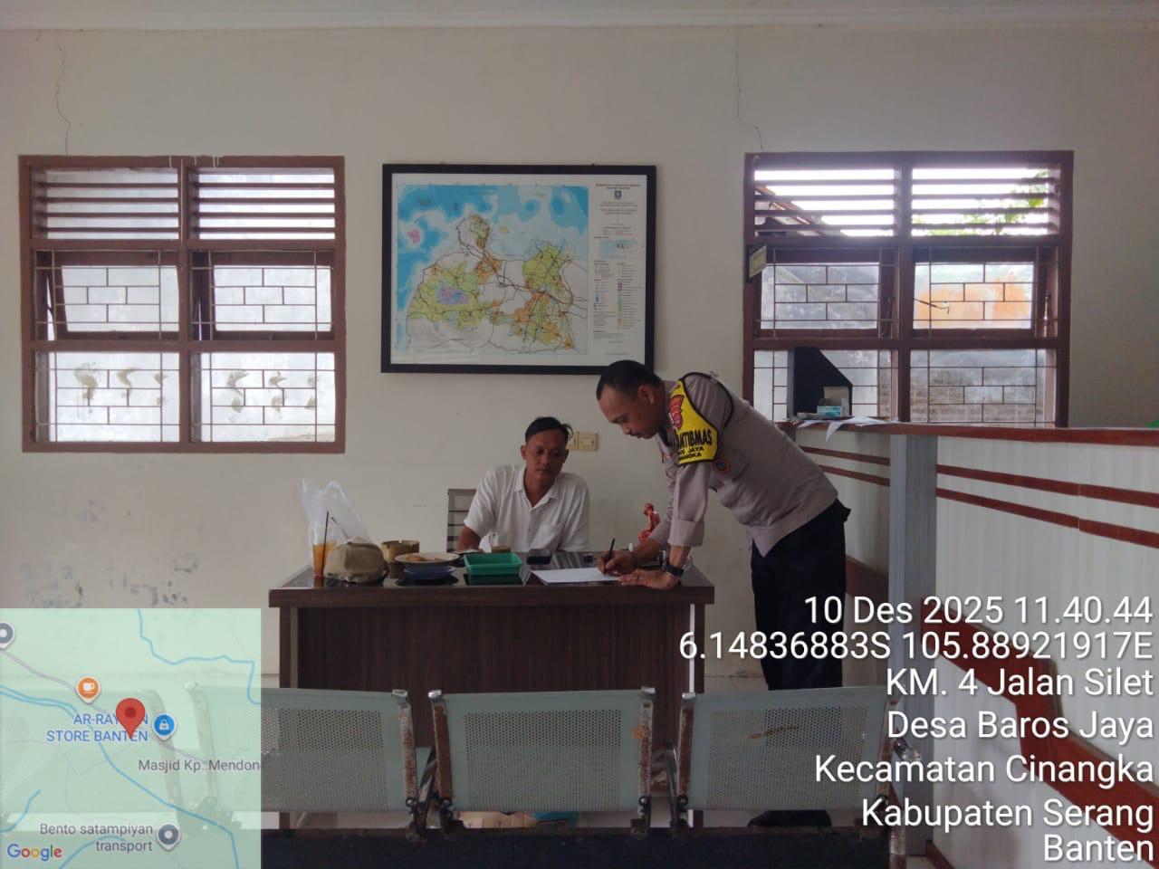 *CILEGON* dalam Rangka Mengantisipasi Gktm di wilayah Personil Bhabinkamtibmas Cinangka melakukan patroli Dialogis dengan Kepala Desa dan warga dan Menanyakan situasi Kamtibmas di wilayah dalam Rangka Menjaga Harkamtibmas di Desa Binaannya Kecamatan Cinangka Kab. Serang. Rabu (10/12/2025).
