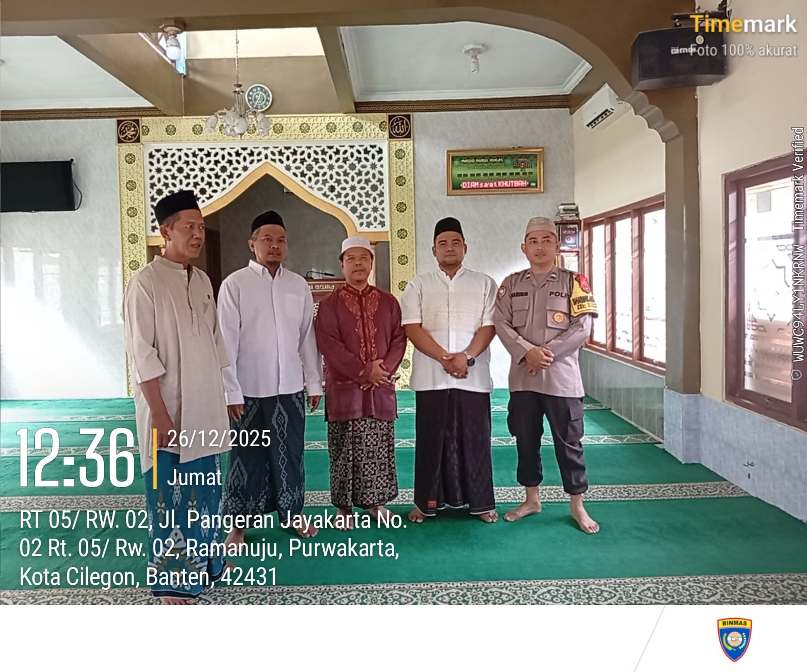 Cilegon - Guna memastikan Harkamtibmas tetap berlangsung aman kondusif,Bhabinkamtibmas Polsek Ciwandan Polres Cilegon Polda Banten menyambangi DKM pengurus Masjid Usai Sholat Berjama’ah, Jum'at (26/12/2025).