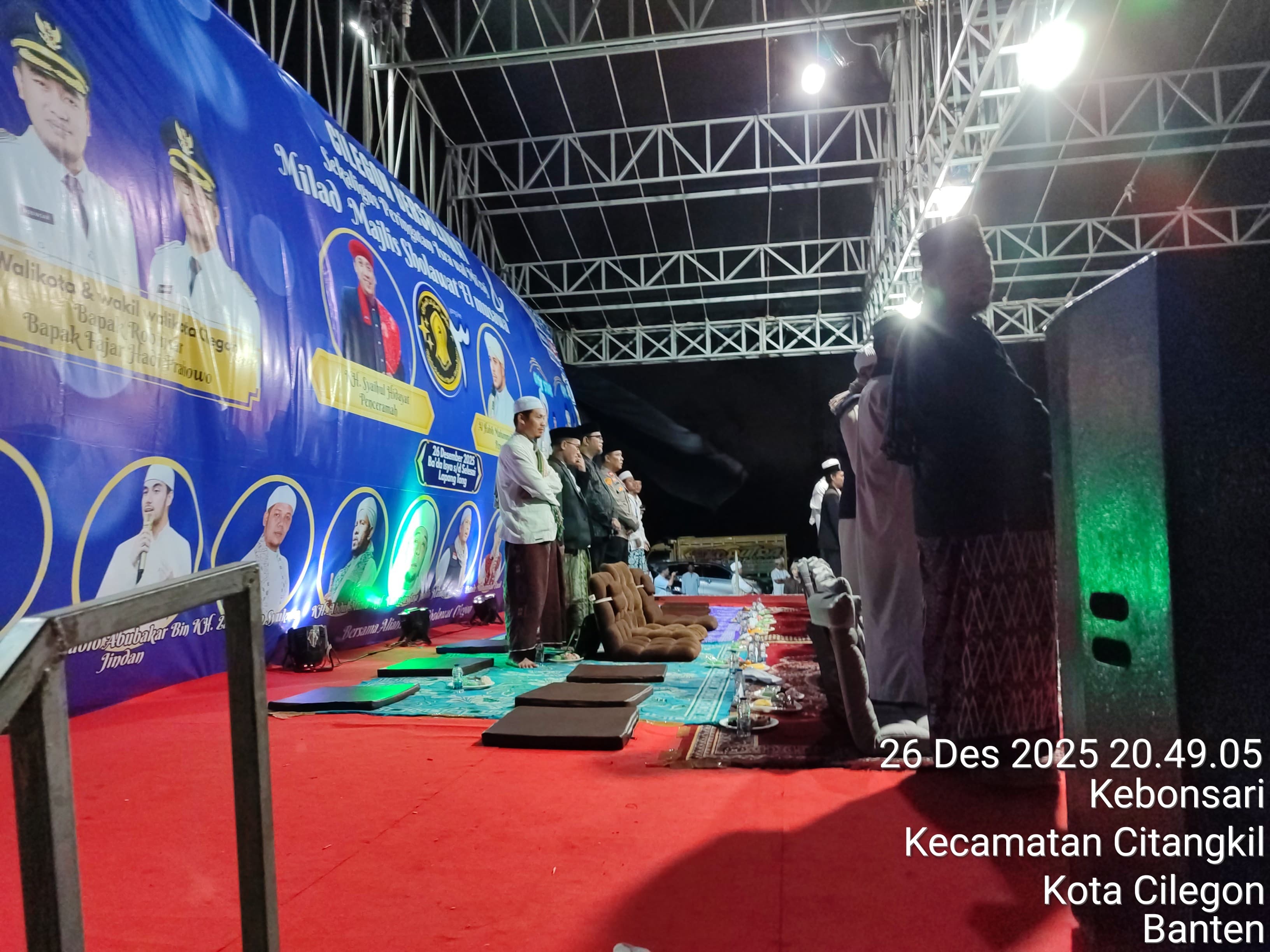 Cilegon - Polres Cilegon melalui Polsek Ciwandan melaksanakan monitoring kegiatan Gema Cilegon Bersholawat dalam rangka Majlis Sholawat El-Musawa ke-3 dan peringatan Isro Mi'raj Nabi Muhammad SAW di Lapangan Tong Alamat, Kebon Sari, Citangkil, Minggu (28/12/2025).