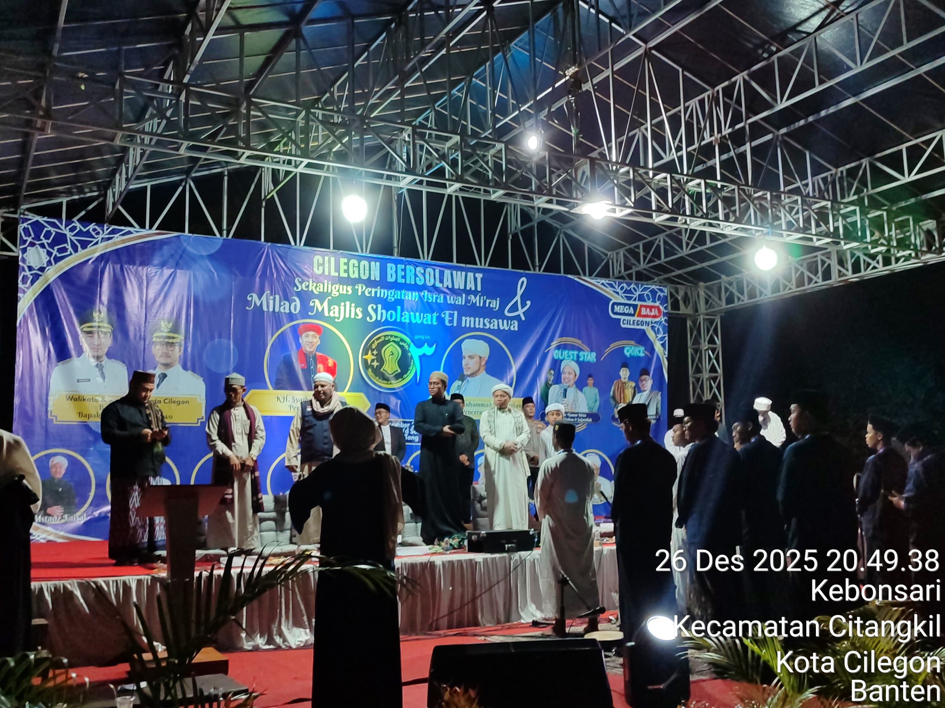 Cilegon - Polres Cilegon melalui Polsek Ciwandan melaksanakan monitoring kegiatan Gema Cilegon Bersholawat dalam rangka Majlis Sholawat El-Musawa ke-3 dan peringatan Isro Mi'raj Nabi Muhammad SAW di Lapangan Tong Alamat, Kebon Sari, Citangkil, Minggu (28/12/2025).