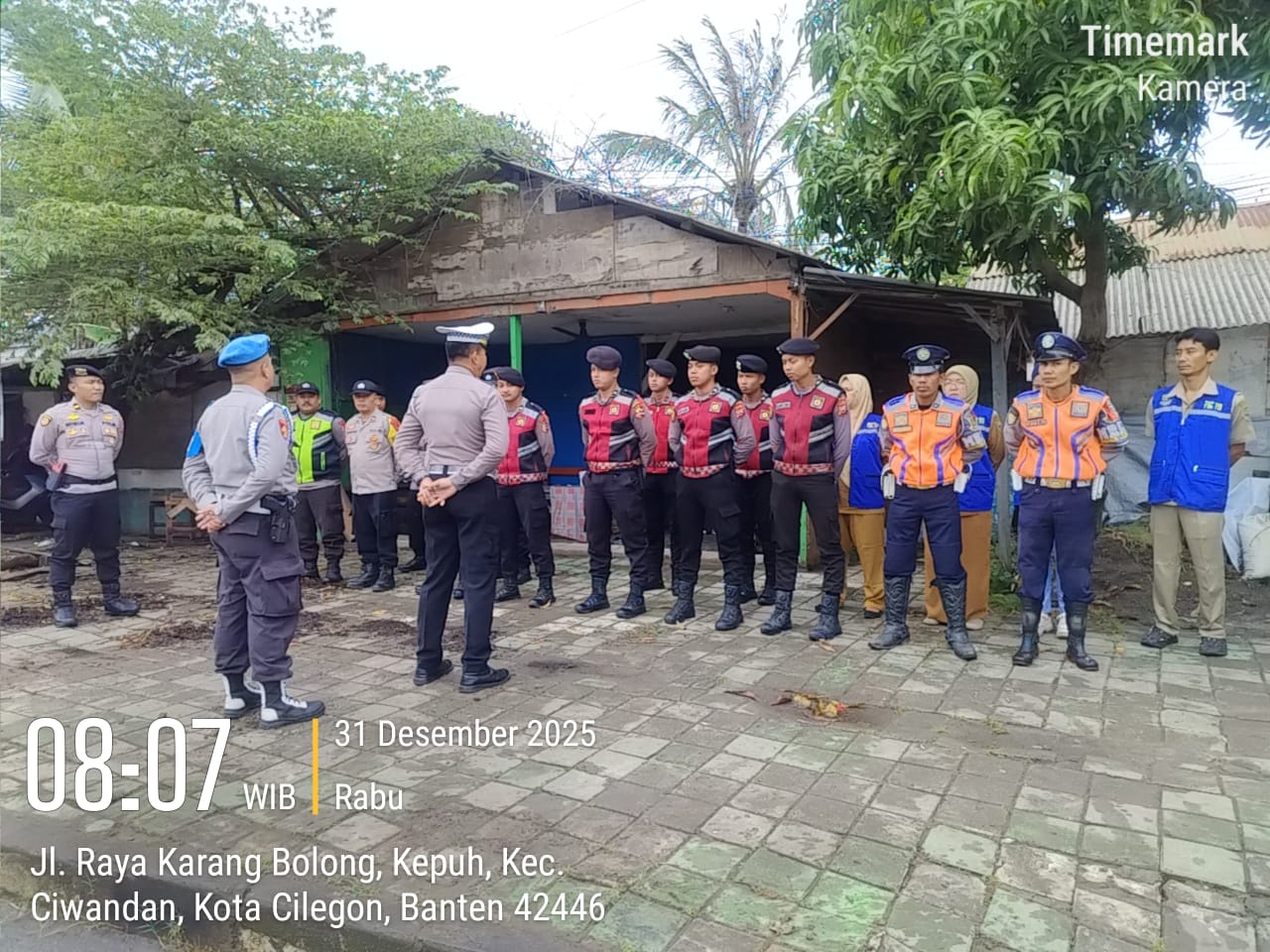 Cilegon - Personil Pospam 5 Ciwandan Polsek Ciwandan Polres Cilegon Polda Banten melaksanakan Apel Kesiapan Pelaksanaan kegiatan pengamanan Arus Lalu-lintas Wisata Dalan Operasi Lilin Maung 2025, Rabu (31/12/2025)