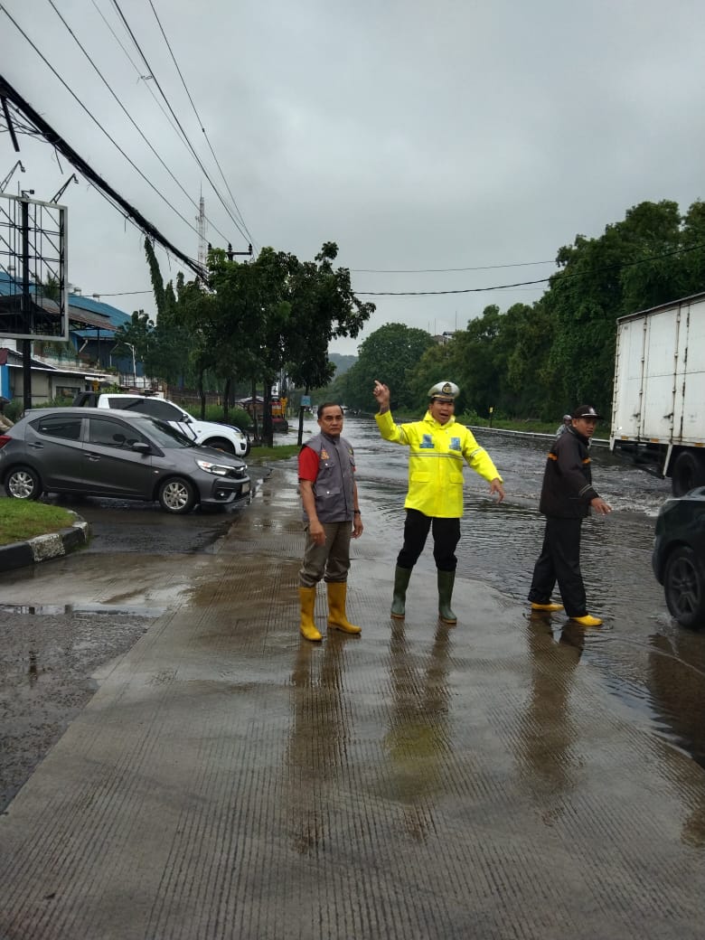Personil Polsek Ciwandan Alihkan Arus Lalu-Lintas Dampak Dari Genangan Air