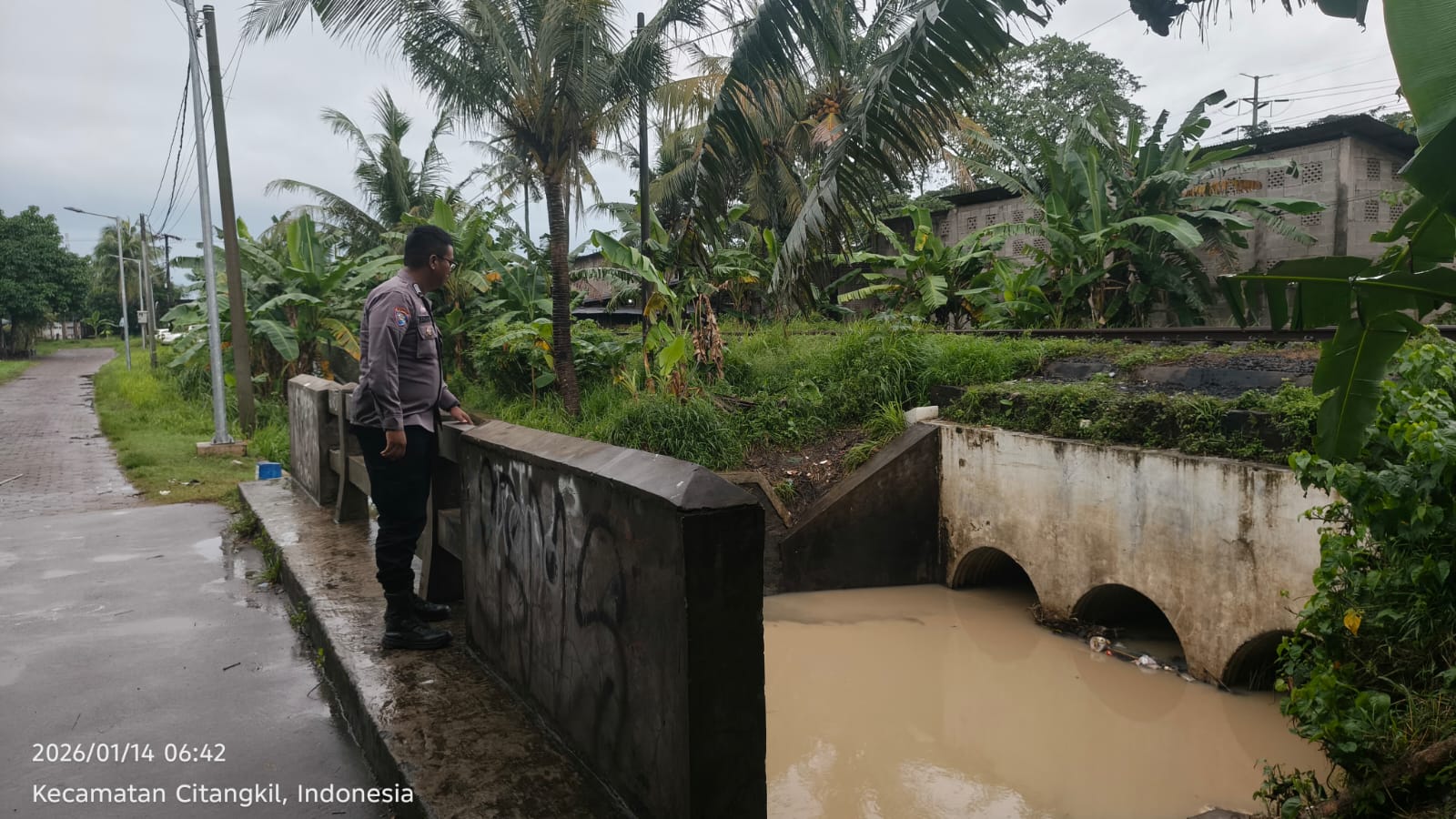 Cilegon - Dalam rangka antisipasi bencana alam personil Polsek ciwandan mengecek debit air di beberapa titik aliran sungai salah satunya yaitu kalimuk RT 005 RW 006 Kelurahan samang Raya Kecamatan citangkil Kota Cilegon, Rabu (14/01/2026).