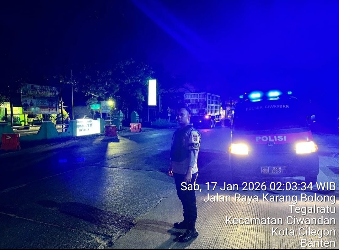 Cilegon - Personil Polsek Ciwandan Polres Cilegon Polda Banten Dalam Pelaksanaan Kegiatan Patroli dengan menyalakan lampu rotator berwarna biru di Daerah Hukum Polsek Ciwandan Polres Cilegon Polda Banten dari malam hingga dini hari, dalam rangka menciptakan situasi aman dan kondusif, Sabtu (17/01/2026).