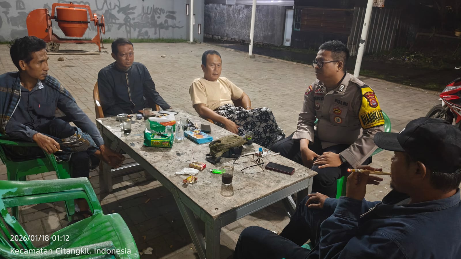 Cilegon - Bhabinkamtibmas Polsek Ciwandan Polres Cilegon Polda Banten Melaksanakan Patroli Kunjungan Malam dan terus memberikan pembinaan dan penyuluhan tentang pentingnya menjaga kamtibmas di daerah hukum Polsek Ciwandan Polres Cilegon Polda Banten, Minggu (18/01/2026).