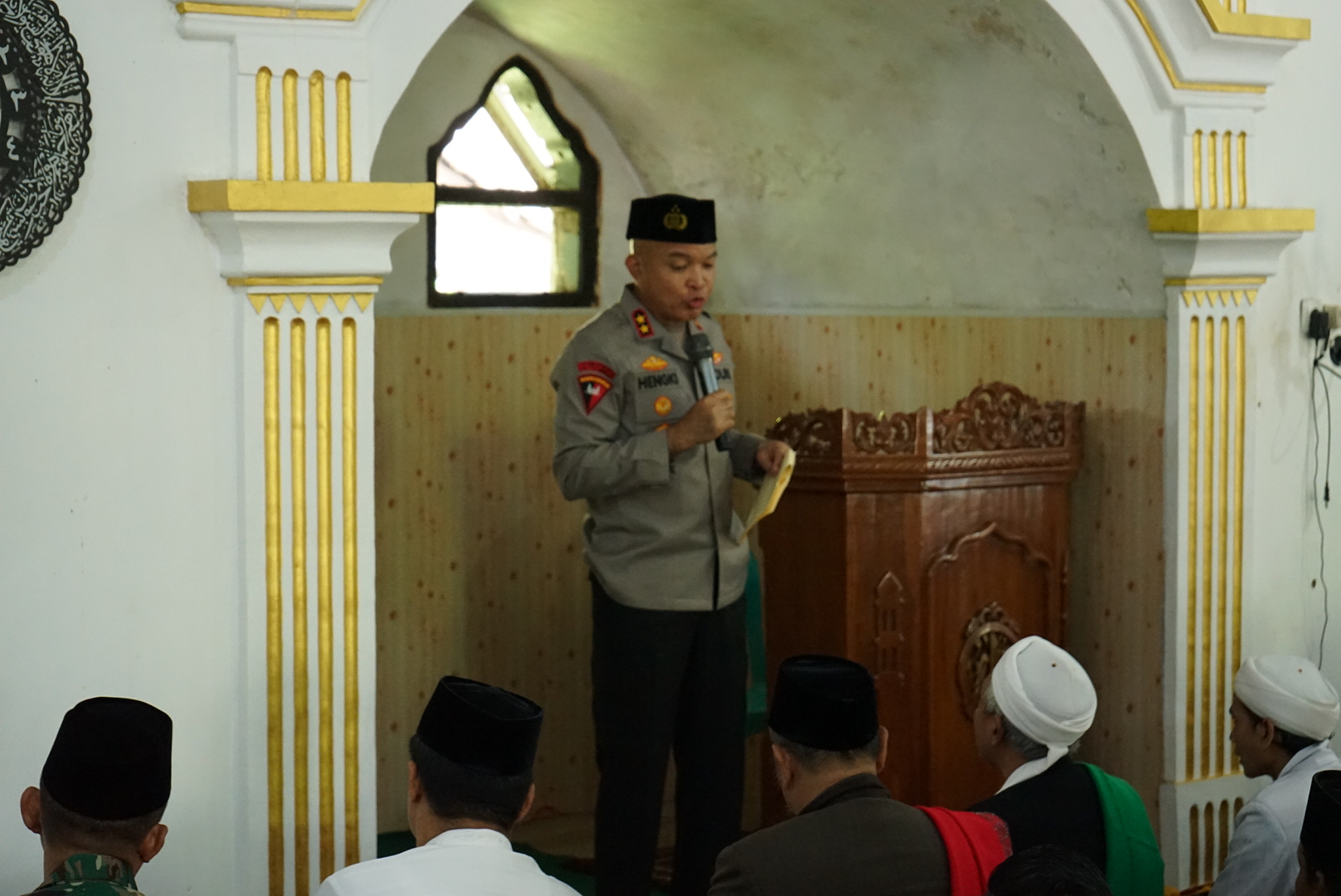 Cilegon –Kapolres Cilegon AKBP Dr Martua Raja Taripar Laut Silitonga S.H S.IK M.S.I mendampingi Kapolda Banten Irjen Pol Hengki S.IK,M.H melaksanakan kegiatan Salat Jumat Keliling (Jumling) di Masjid Miftahul Huda, Pondok Pesantren TQN Al-Mubarok, Kampung Pasir Angin, Desa Cinangka, Kecamatan Cinangka, Kabupaten Serang ,Jumat 10/4/26 Kegiatan tersebut diikuti oleh para Pejabat Utama Polda Banten dan pejabat utama Polres Cilegon, tokoh agama, tokoh masyarakat, serta para jamaah salat Jumat. Dalam kesempatan tersebut, Kapolda Banten menyampaikan bahwa program Salat Jumat Keliling merupakan salah satu upaya Polri untuk lebih mendekatkan diri dengan masyarakat sekaligus mempererat silaturahmi. “Program Salat Jumat Keliling ini merupakan ikhtiar kami untuk mempererat silaturahmi dan menghadirkan Polri di tengah masyarakat, tidak hanya dalam tugas, tetapi juga berbagi rasa dalam suka dan duka,” ujar Kapolda Banten. Kapolda Banten juga menyampaikan bahwa situasi kamtibmas di wilayah Banten saat ini dalam keadaan aman dan kondusif. “Alhamdulillah, situasi kamtibmas di Banten saat ini aman dan kondusif, sehingga masyarakat dapat melaksanakan ibadah dengan tenang,” lanjutnya. Selain itu, Kapolda Banten mengingatkan bahwa ke depan tantangan kamtibmas akan semakin kompleks seiring perkembangan teknologi dan informasi. “Kami menghimbau masyarakat agar waspada terhadap penyebaran hoaks, ujaran kebencian, provokasi isu SARA, kejahatan berbasis teknologi, serta penyalahgunaan narkoba,” tegasnya. Lebih lanjut, Kapolda turut mengajak masyarakat untuk tidak mudah terprovokasi dan lebih bijak dalam menggunakan media sosial, serta menjaga persatuan dan kerukunan. “Mari kita bersama-sama menjaga persatuan dan meningkatkan toleransi antar umat beragama demi terciptanya situasi yang aman dan damai,” tambahnya. Diakhir, Kapolda Banten mengajak masyarakat untuk memanfaatkan layanan kepolisian. “Saya mengajak seluruh masyarakat untuk memanfaatkan layanan kepolisian, salah satunya layanan Call Center 110 yang aktif 24 jam secara gratis. Melalui layanan ini, masyarakat dapat dengan mudah melaporkan setiap gangguan kamtibmas maupun kejadian yang membutuhkan kehadiran polisi, sehingga dapat segera ditindaklanjuti secara cepat, tepat oleh petugas,” tutup Kapolda Banten. Hadir dalam kegiatan tersebut untuk.pejabat utama Polda Banten 1). Dirreskrimum Polda Banten KOMBES POL. DIAN SETYAWAN, S.H., S.I.K., M.Hum 2). Dirbinmas Polda Banten KOMBES POL IMAM TARMUDI, S.I.K., M.H. 3). Dirlantas Polda Banten Kombes Pol. Arief Kurniawan, S.I.K. 4). Kabid Humas Polda Banten KOMBES POL. Maruli Ahiles Hutapea, S.I.K. 5). Kabid Propam Polda Banten KOMBES POL. MURWOTO, S.H., S.I.K., M.H. 6). Dirintel Polda Banten KOMBES POL. ATOT IRAWAN, S.I.K., M.M 8). Kapolres Cilegon AKBP Dr. MARTUA RAJA TARIPAR LAUT SILITONGA, S.H, S.Ik, M.Si. Pejabat Utama Polres Cilegon 1). Wakapolres Cilegon KOMPOL M. RIZKI SALATUN, S.IK. 2). Kabag SDM Polres Cilegon KOMPOL ENTANG CAHYADI, S.H., M.A 3). Kabaglog Polres Cilegon AKP SUDIBYO WARDOYO, S.H, M.M 4). Kasat Sabhara Polres Cilegon AKP AGUS HENDRATNO 5). Kasat Lantas Polres Cilegon AKP RIDWAN S.TK., S.I.K., M.H 6). Kasi Humas Polres Cilegon AKP SIGIT DERMAWAN, S.H. 7). Kasie Propam Polres Cilegon AKP HERI SUSANTO, S.H, M.M. 8). Kapolsek Cinangka AKP RUSNATA, S.H., S.KOM. 9). Kasiwas Polres Cilegon IPTU HARIS SURAHMAN 10). Kasat Intelkam Polres Cilegon IPTU RISWAN WIJAYA, S.H Tokoh masyarakat 1). Pimpinan Ponpes TQN Al Mubarok KH.RD.M.YUSUF PRIANADI,SH 2). Tokoh Agama Pimpinan Ponpes Nur Sejati KH.DAMANHURI 3). Ketua DPC NU Kec.Cinangka USTADZ.DAMAN